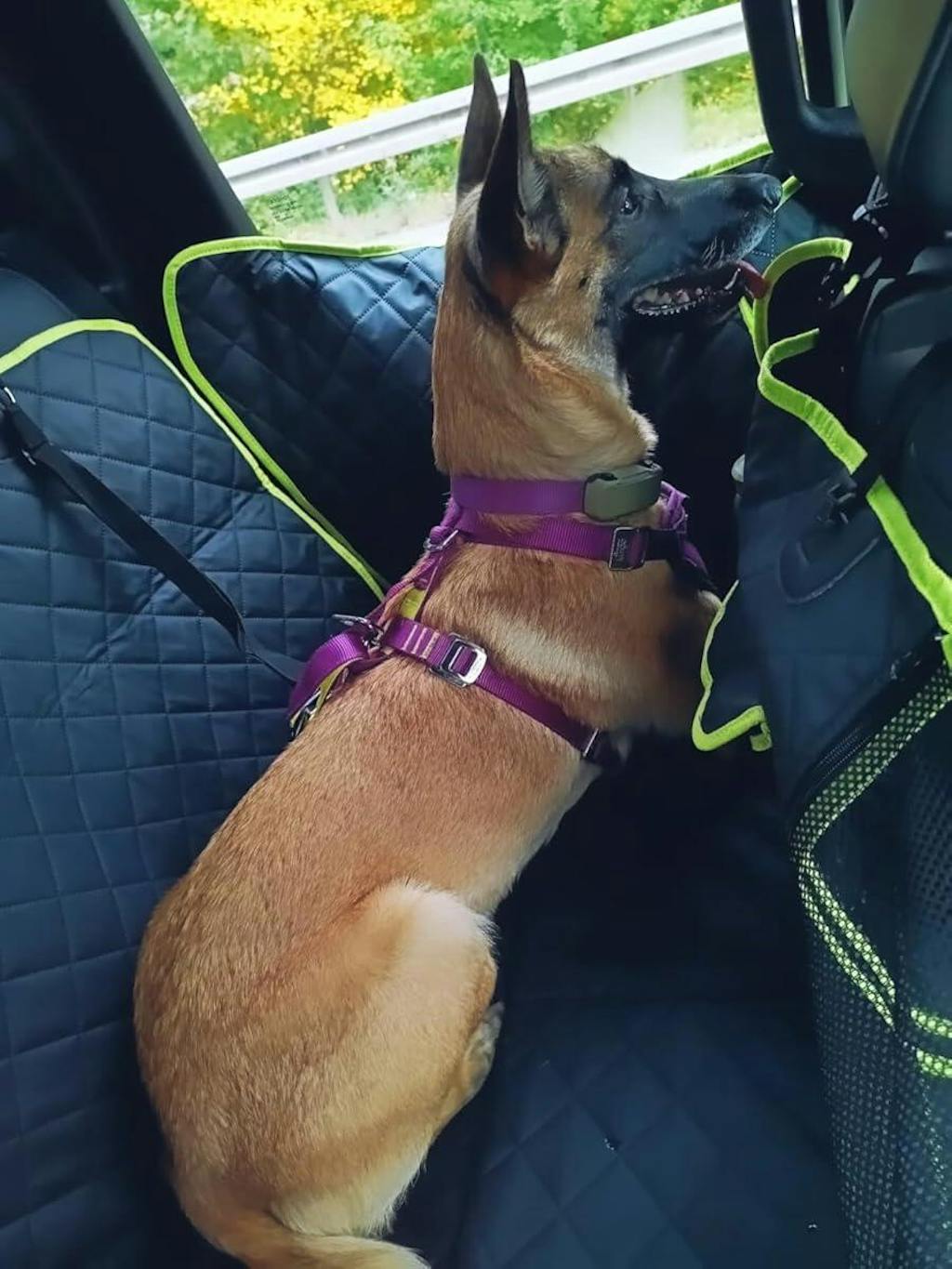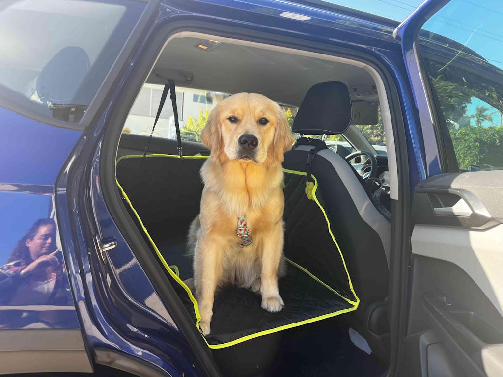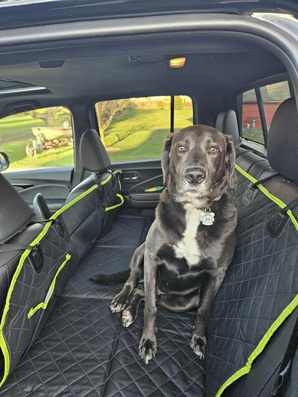 I absolutely love my Pecute backseat cover and so does Mellie! I especially like the anchors, as she is a big dog and they help keep her secure. The quality and durability of the material is great. I love the feature available to fold up one side and have a human ride in the backseat as well. I have not seen another cover like this yet! The green paw print design is especially cute as well, and the carrying case is so convenient! Great product overall
